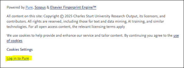 Charles Sturt University Research Output (CRO) is the showcase for research and scholarly outputs created by university researchers. Higher Degree Research (HDR) candidates must upload the final version of their thesis to CRO before they can graduate. All research outputs are Open Access and are freely available to the world, unless they contain confidential or sensitive content that should not be shared.
